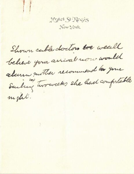 Outline of telegram written by W.R. to Robert from Hotel St. Regis.
