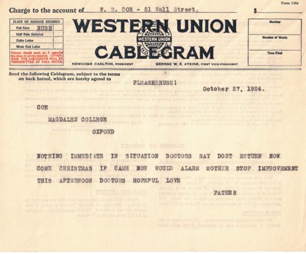 Cablegram from W.R. to Robert, October 1924.