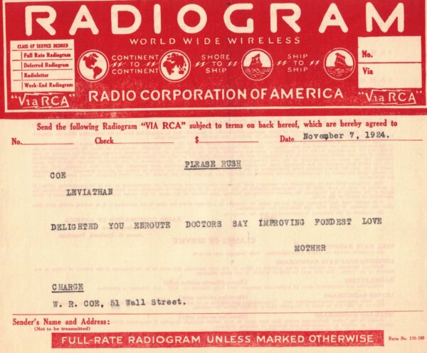 A few years later in the summer of 1924, Mai had an attack of jaundice at the ranch in Wyoming, and her stomach became painfully extended. According to W.R., the jaundice also affected her liver. She was later moved to the St. Regis Hotel in New York City, to be closer to her doctors. W.R. corresponded with Robert in Oxford, England, who was eager to travel home to be with his mother. In this cablegram, W.R. urges Robert to wait until Christmas to avoid alarming Mai. Robert didn’t wait much longer and sailed on the USS Leviathan in November.