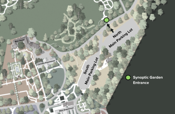 The Synoptic Garden entrance is located on the Main Entrance Drive, across from the North Parking Lot. See map below!
